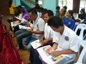 Reading Braille books by blind trainees during function organised by Smart Reading Club of Sabah State Library Sandakan during their visit on 12th April 2014