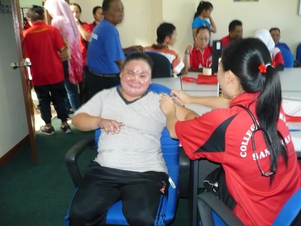 Nurses from Sandakan College of Nursing giving blood pressure tests to blind trainees on 3rd January 2014 Tweet Pin It