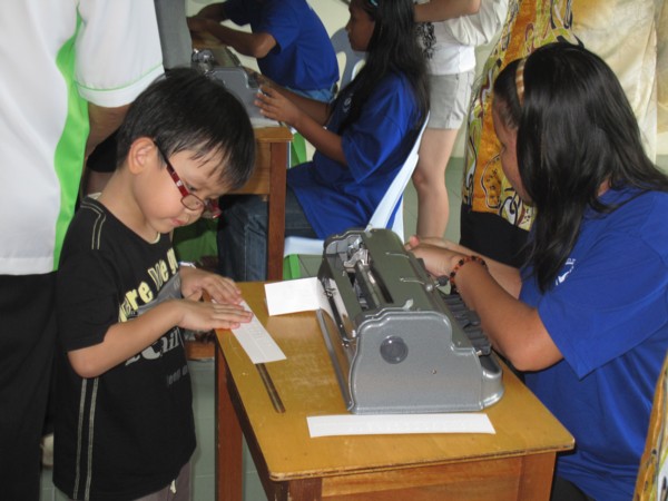 A young visitor reading Braille during visit by members of Visitors from Machinery & Automobile Parts Traders Association Sandakan on 10th September 2011