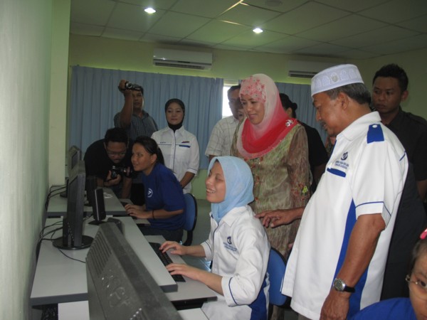 Briefing Datin Seri Panglima Toh Puan Hajjah, wife of Sabah TYT, on the basic ComputerTraining given to the blind trainees during her visit on 3rd July 2011 Tweet Pin It