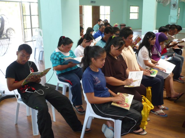 Reading Braille books by blind trainees during function organised by Smart Reading Club of Sabah State Library Sandakan during their visit on 12th April 2014 Tweet Pin It