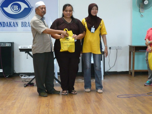 Presentation of gift to blind participant by Smart Reading Club of Sabah State Library Sandakan on 12th April 2014 Tweet Pin It