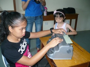 Young visitors accompanying staff of Hong Leong Bank Berhad, Sandakan is curious on the complexity of Braille writing on 5th June 2014. Tweet Pin It