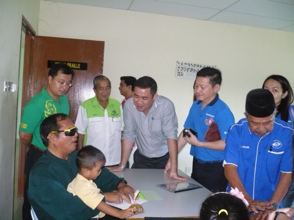 Visitors from Hong Leong Bank Berhad, Sandakan observing braille reading skills by braille teacher on 5th June 2014.