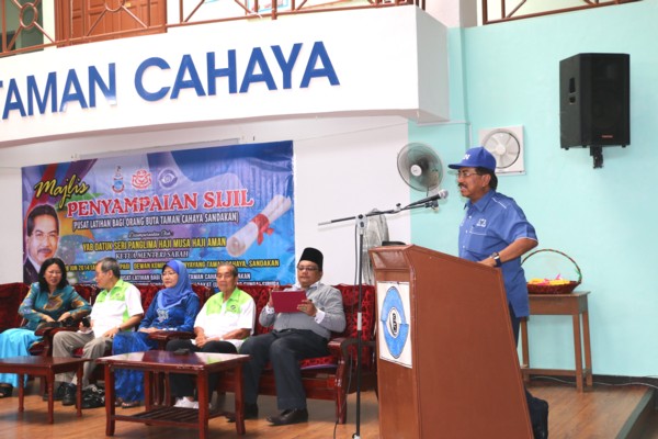 Sabah Chief Minister giving a speech during the Graduation Function for the visually impaired trainees on 22nd June 2014 at Taman Cahaya. Tweet Pin It