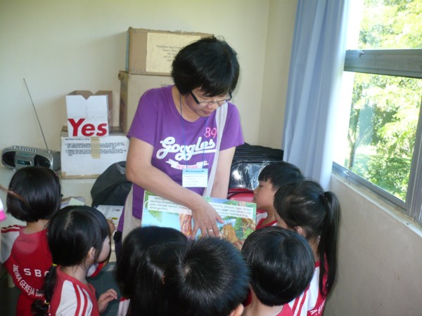 Young visitors from kindergarten school of Sandakan Baptist Church being explained on how to read braille story books during their visit on 10th June 2014 Tweet Pin It