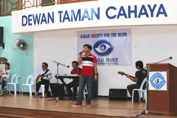 Welcome song by a blind trainee during visit by Senior Citizens Association Sandakan on 24th August 2014.