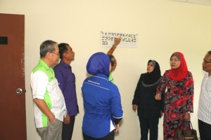 The Minister of Community Development & Consumer Affairs Sabah (YB Datuk Hjh Jainab DSP Hj Ahmad Ayib), Head Wanita UMNO Sabah (Datuk Armani Hj Mahiruddin), Sabah Welfare Department’s Director (Mr Ethong Terang), Sandakan District Welfare Office’s Officer (Mr Dominic Chong) and guests being briefed by Taman Cahaya’s Supervisor on Braille writing during their visit on 27th September 2014.