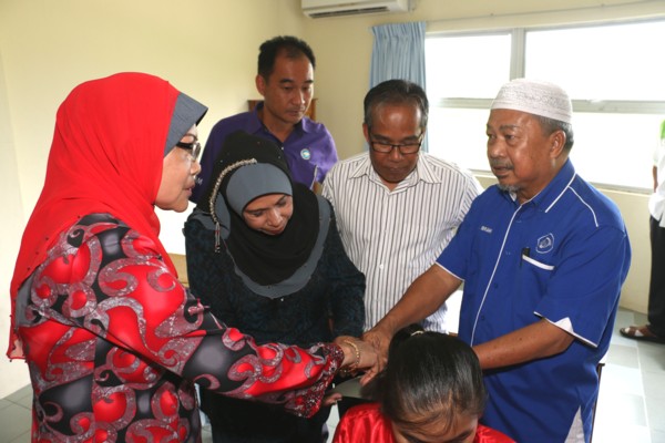 The Minister of Community Development & Consumer Affairs Sabah (YB Datuk Hjh Jainab DSP Hj Ahmad Ayib), Head Wanita UMNO Sabah (Datuk Armani Hj Mahiruddin), Sabah Welfare Department’s Director (Mr Ethong Terang), Sandakan District Welfare Office’s Officer (Mr Dominic Chong) and guests being briefed by Taman Cahaya’s Supervisor on Braille writing by blind during their visit on 27th September 2014.