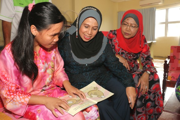 The Minister of Community Development & Consumer Affairs Sabah (YB Datuk Hjh Jainab DSP Hj Ahmad Ayib), Head Wanita UMNO Sabah (Datuk Armani Hj Mahiruddin), Sabah Welfare Department’s Director (Mr Ethong Terang), Sandakan District Welfare Office’s Officer (Mr Dominic Chong) and guests were given a demonstration on reading Braille written story book by a blind inmate during their visit on 27th September 2014.