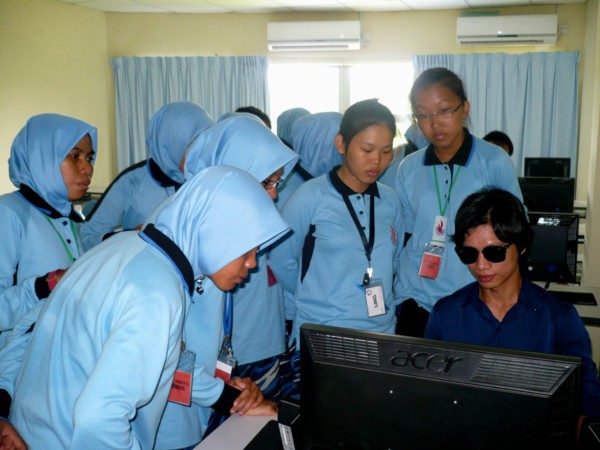 A blind trainee demonstrating his computer skill to the National Service trainees from Sandakan camp during their visit on 20th September 2014. Tweet Pin It
