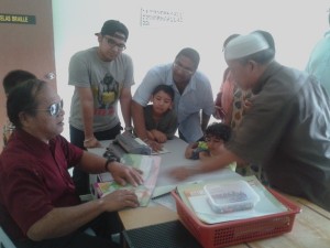 Braille instructor giving a Braille reading demonstration to the members of the Sandakan Indian Association on 6th October 2014.
