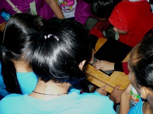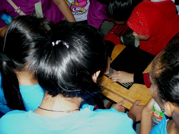 Youth members of Sandakan Basel Church observing how Braille wordings are imprinted on paper during their visit to Taman Cahaya on 29th November 2014.