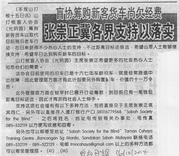 Appeal for public sponsorship of a vehicle by Sandakan Branch