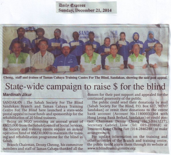 Launching of Sabah State Wide Postal Appeal by Taman Cahaya Training Centre For The Blind, Sandakan – Daily Express Newspaper Tweet Pin It
