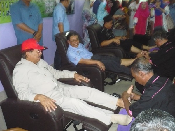 Sabah Chief Minister, VIPs and invited guests enjoying massage given by blind masseurs in conjunction with the opening of the Reflexology & Spa Centre at Taman Cahaya on 23rd December 2014.