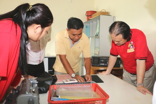 Taman Cahaya’s Assistant Supervisor explaining Braille writing by hand technique to YB Wong Tien Fatt (P186) and members of Democratic Action Party Sandakan during their visit to Taman Cahaya on 15th February 2015 in conjunction with the Chinese New Year festival.