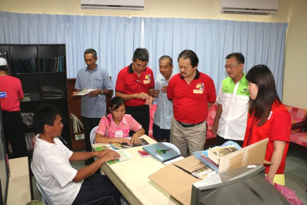 YB Wong Tien Fatt (P186) and members of Democratic Action Party Sandakan being given a skill demonstration by a blind trainees on reading from Braille storybooks during their visit on 15th February 2015 in conjunction with the Chinese New Year festival.