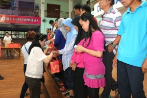 Visitors from Juara Gemilang of Bandar Maju Sandakan giving out donation of cookies in Tupperware packages and refreshment to the blind trainees/inmates during their visit to Taman Cahaya on 8th March 2015. Tweet Pin It