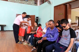 Presentation of donations to blind trainees/inmates by members of Persatuan Penganut Agama Buddha Tian Xuan Sandakan during their visit to Taman Cahaya on 8th March 2015.