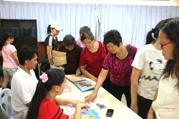 Members (young and old alike) of Basel Christian Church of Malaysia (Sandakan Parish) during their visit to Taman Cahaya on 18th April 2015 studying how Braille typed story books are read and used by the blinds.