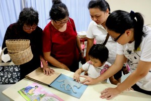 Members (young and old alike) of Basel Christian Church of Malaysia (Sandakan Parish) during their visit to Taman Cahaya on 18th April 2015 studying how Braille typed story books are read and used by the blinds. Tweet Pin It