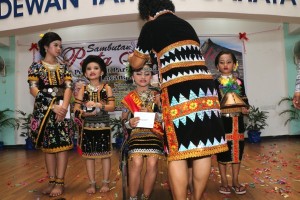 Madam Sarih Duling crowning the winner of the children Beauty & Fashion Competition together with runners up during the Harvest Festival Celebration held on 3rd May 2015 at Taman Cahaya. Tweet Pin It