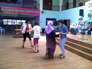 Members of the ladies Christian Sharing Group from St Mary’s Cathedral Sandakan dancing with staff members of Taman Cahaya during their visit on 30th April 2015.
