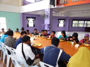 Blind inmates/trainees and their children being served with free food/refreshment by Joint delegates from the Sandakan Indian Association, Sabah MIC Youth, MIC Libaran and Manoharan Junior Tennis Academy during their visit on 13th June 2015.