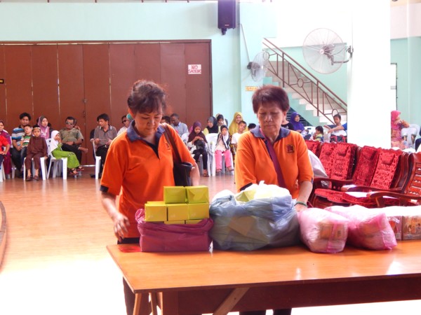 Members of Pau Kung Temple of Sandakan getting ready donations for presentation to the blind trainees/inmates during their visit to Taman Cahaya on 5th July 2015.