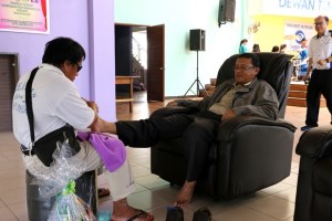 A visitor from Asia Oil Palm Sdn Bhd and Asia Palm Oil Mill having foot reflexology by a blind during visit to the Taman Cahaya on 31st August 2015. Tweet Pin It