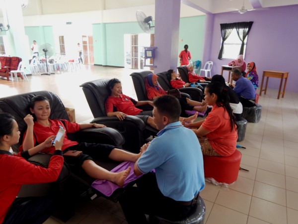 Visitors from Sandakan College of Nursing and Zhang Clan Association enjoying massage by blind masseurs during the visit to Taman Cahaya on 26/9/2015.
