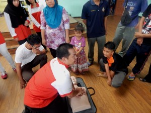 Paramedical instructors from University of Malaysia Sabah showing their CPR technique to the assembly during their visit to Taman Cahaya on 29th November 2015. Tweet Pin It