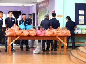Donation food stuff parcels awaiting distribution by visitors from IOI Edible Oil during visit to Taman Cahaya on 22nd December 2015.