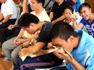 Visually impaired inmates and trainees appreciating the food and refreshment served by IOI Edible Oil during visit to Taman Cahaya on 22nd December 2015.