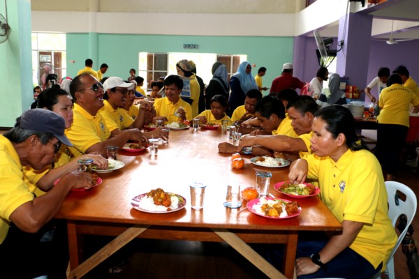 Start of the food enjoyment by the visually impaired trainees, ex-trainees and their family members in conjunction with the New Year 2016 celebration function held at Taman Cahaya on 24/1/2016.