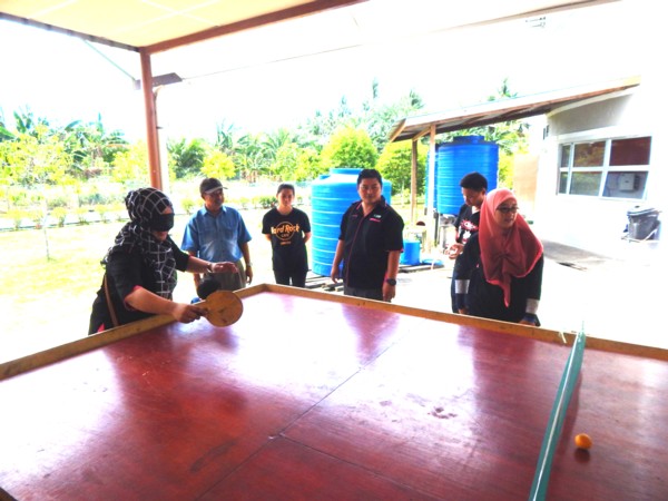 Blindfolded staff of Green Edible Oil Sdn Bhd, Sandakan challenging blind players in ping pong games during their visit on 23/4/2016.