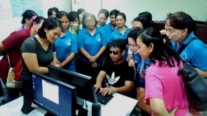 Members of Roman Catholic Church (Women Section), Beluran observing blind operating computer during visit to Taman Cahaya on 23th April 2017.
