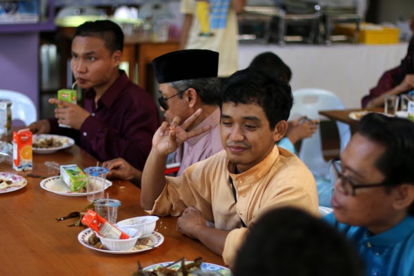 Visually impaired enjoying food refreshment during the joint Harvest Festival/Hari Raya Festival celebration held at Taman Cahaya on 9th July 2017.