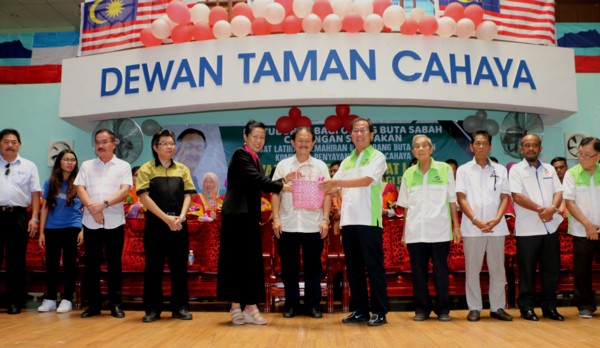 Presentation of souvenir by the Society’s Sandakan Branch’s Chairman Mr Chong Yee Fah to the Society’s President Datuk Rosalind Chew during the Convocation Ceremony for the visually impaired trainees held on 26/8/2018. Tweet Pin It