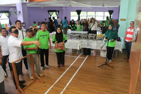 Mr Max Million Lee, the representative of Datuk Frankie Poon (Sabah Minister of Youth & Sports) giving a dart shot to declare open the World Sight Day function held on 14th October 2018 at Taman Cahaya n conjunction with the Sabah Welfare Month 2018.