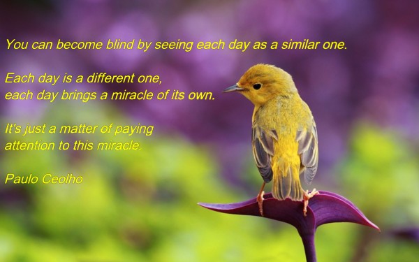 Quote For The Month You can become blind by seeing each day as a similar one. Each day is a different one, each day brings a miracle of its own. It’s just a matter of paying attention to this miracle. - Paulo Ceolho [June 2015] Tweet Pin It